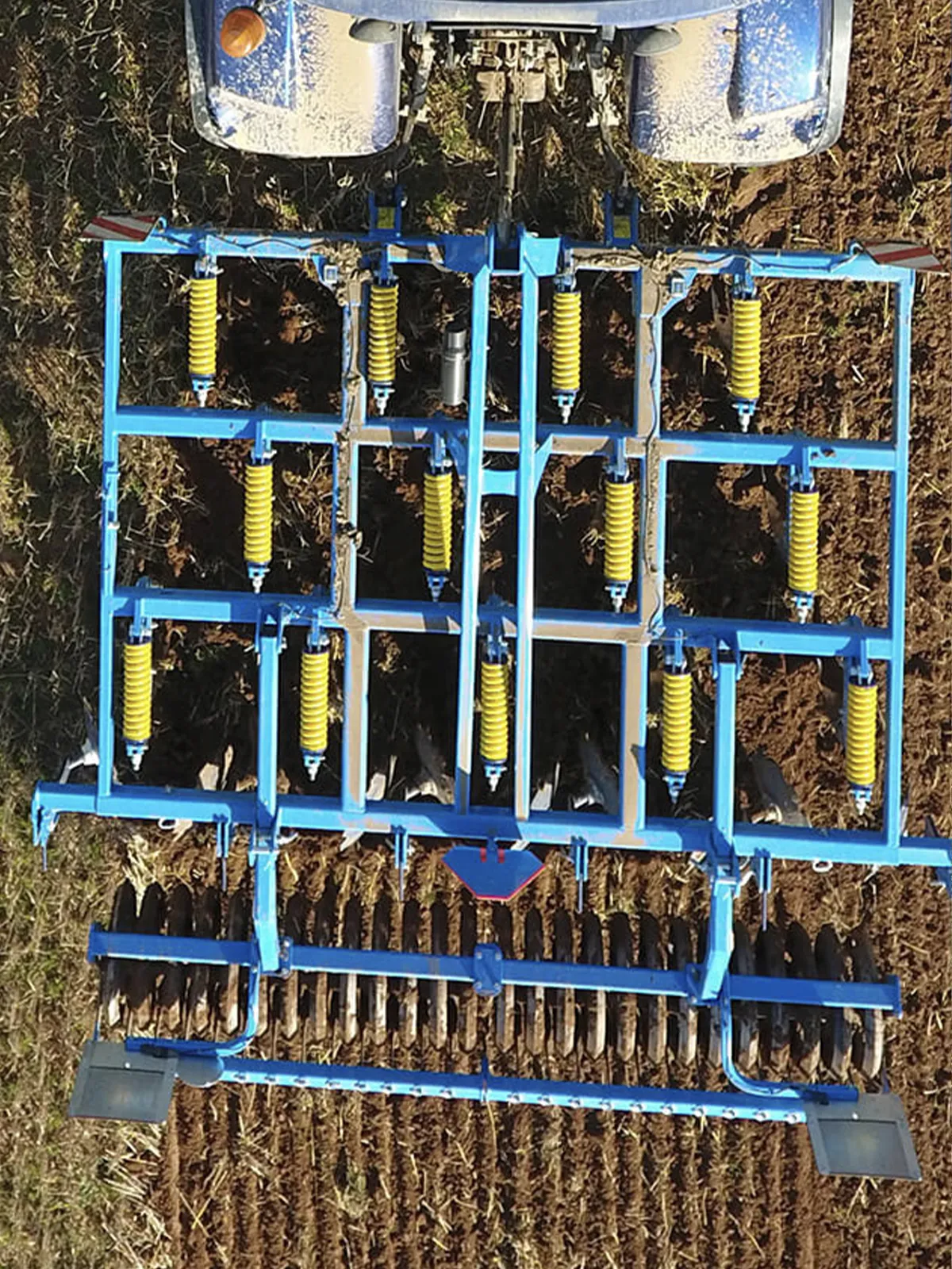 - Trabajo de rastrojo superficial (6–20 cm) con aletas para mezclar residuos.